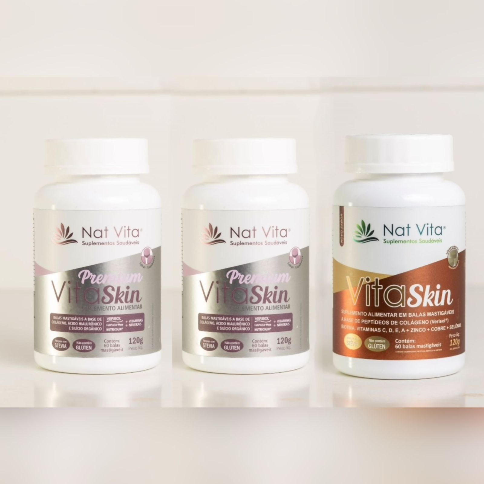 As Balas de Colágeno VitaSkin da Nat Vita apresentam diversos sabores, sendo feitas com peptídeos de colágenos (Verisol®), com Biotina, Vitaminas C, E, A, Zinco, cobre e Selênio.